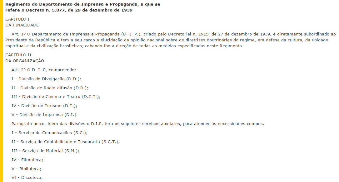 O DIP foi fruto da ampliação da capacidade de intervenção do Estado no âmbito dos meios de comunicação e da cultura. Tinha como função elucidar a opinião pública sobre as diretrizes doutrinárias do regime, atuando em defesa da cultura, da unidade espiritual e da civilização brasileira. (CAPELATO, 1999, p. 172).