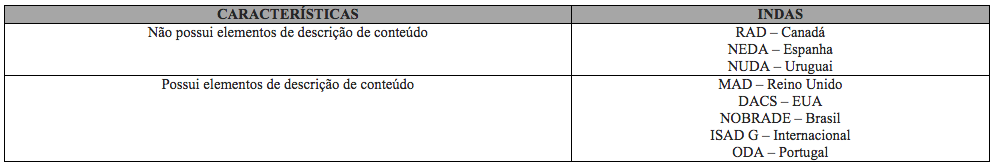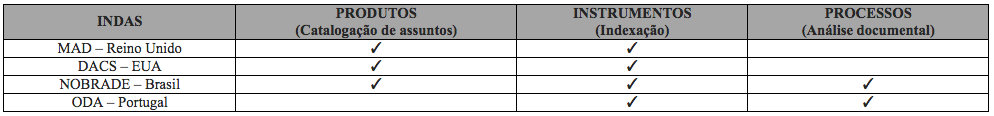 Sendo assim, foram analisadas as características das vertentes teóricas do TTI (análise documental, catalogação de assuntos, indexação), identificando as características de cada uma das vertentes (respectivamente, processos, produtos e instrumentos) de quatro INDA (conforme quadro 8) que apresentam em sua estrutura esclarecimentos sobre a descrição de conteúdo: MAD, DACS, NOBRADE, ODA. Embora apresente a descrição de conteúdo em sua estrutura, a ISAD(G) não aborda elementos suficientes relacionados à temática para que possa ser realizada a análise proposta por esta pesquisa.