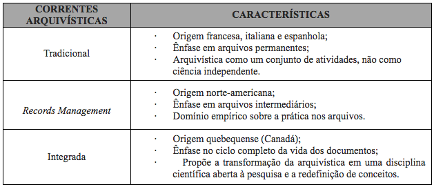 Para Lopes (2009), essa seria a terceira corrente do pensamento arquivístico, chamada integrada. De acordo com a perspectiva da arquivística integrada, devem-se agrupar os princípios, as normas e as técnicas que caracterizam suas funções em gestão de arquivos, preocupando-se com o tratamento do conjunto do ciclo de vida dos documentos. No Quadro 1, estão sistematizadas as informações sobre as três correntes do pensamento arquivístico abordadas neste trabalho.
