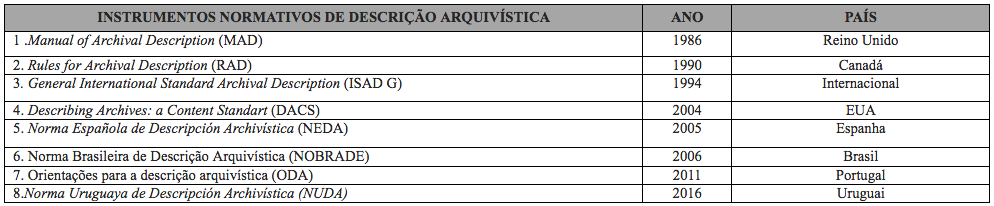 Além dos países elencados no Quadro 5, há outros que fazem o uso da ISAD(G) na descrição arquivística e, portanto, não desenvolveram seu próprio instrumento normativo de descrição arquivística. Dessa forma, os INDA específicos têm se desenvolvido de acordo com as necessidades de cada país em padronizar o procedimento de descrição a fim de adequar os elementos de descrição em seu sistema de arquivos.