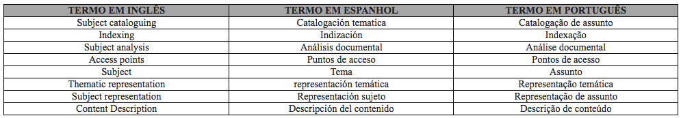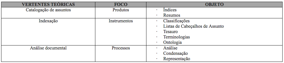Esse universo, por sua vez, apresenta-se, na literatura especializada, sob três vertentes teóricas, nomeadamente: a catalogação de assunto (subject cataloguing) de matriz norte-americana, a indexação (indexing) de matriz inglesa e a análise documental (analyse documentaire), de matriz francesa. (GUIMARÃES, 2009. p. 106).