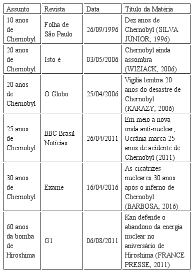 a) Dez anos de Chernobyl, Folha de São Paulo, 26/09/1996 (SILVA JÚNIOR, 1996);