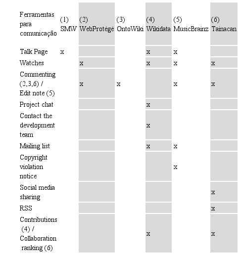 Analisando o aspecto da Comunicação e observando os sistemas que mais se destacam nesse aspecto, tem-se que o WebProtégé, o MusicBrainz e o Tainacan Ontology se destacam em número de ferramentas (6, 5 e 5, respectivamente). É importante observar também a porcentagem das ferramentas para Comunicação de cada sistema, pois, embora os sistemas MusicBrainz e Tainacan Ontology possuam o mesmo número de ferramentas, as ferramentas do MusicBrainz representam 31,25% enquanto as do Tainacan Ontology representam 12,5% do total. Ao mesmo tempo, tem-se que o Wikidata dedica em torno de 25% de suas ferramentas para a Comunicação. Dessa forma, no aspecto Comunicação, o MusicBrainz se destaca em comparação aos demais.