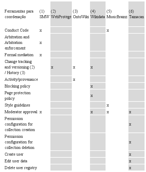 O Tainacan Ontology e o SMW utilizam sua própria abordagem para modelar as entidades OWL: o Tainacan Ontology modela as entidades OWL atribuindo nomes distintos (metadado de dado, metadado de termo, categoria, coleção etc.), conferindo ao usuário a capacidade de poder utilizar os recursos sem conhecer sua nomenclatura. No caso dos sistemas SWM e Wikidata, embora possuam 66,67% e 58,33%, respectivamente, de suas ferramentas dedicadas à Colaboração e Cooperação, boa parte de suas ferramentas tem como objetivo resolver disputas de conteúdo e resolver problemas de conduta de usuários, como mostra a Tabela 2.
