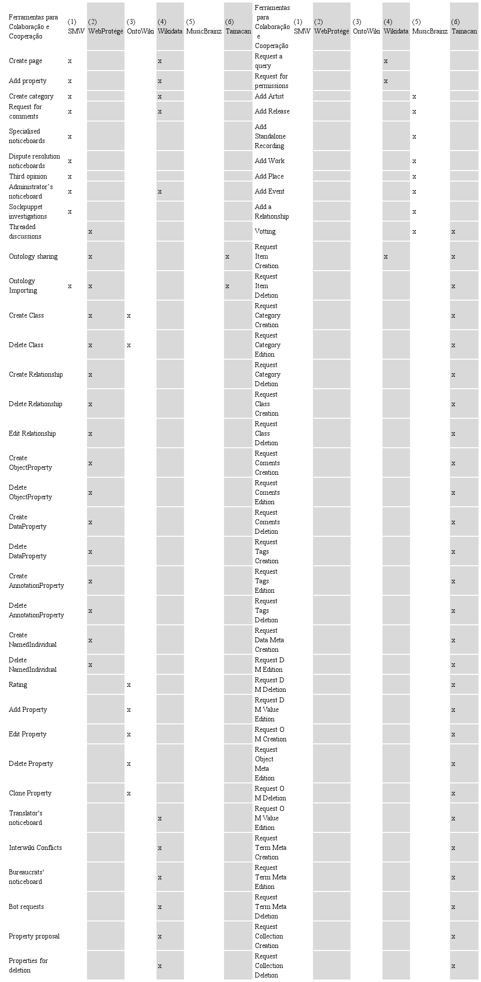 Dada a possibilidade de os sistemas terem ferramentas com funcionalidades em comum, no entanto, com nomes distintos, as mesmas são listadas e associadas a um número que representa o sistema que as nomeiam. Por exemplo, no Quadro 1 há a ferramenta Commenting, associada aos números 2, 3 e 6, que correspondem aos sistemas WebProtégé, OntoWiki e MusicBrainz e a ferramenta Edit Note, associada ao número 5, que representa o sistema Tainacan Ontology. Embora tenham nomes distintos, possuem a mesma funcionalidade.