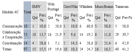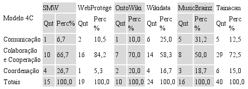 Dando continuidade à análise, a Tabela 2 mostra o resultado da contagem do número de ferramentas colaborativas de cada sistema, classificadas em relação a cada um dos C's do Modelo 4C. Essa análise permite identificar qual o maior foco dos sistemas para edição de ontologias.