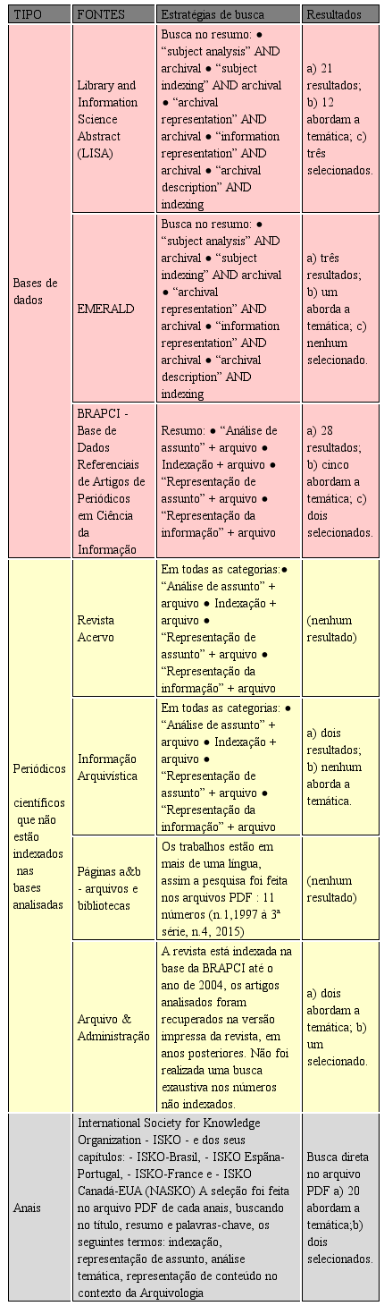 A escolha das fontes de informação pesquisadas justifica-se pelo fato de serem representativas da produção brasileira e internacional em Ciência da Informação, além de periódicos representativos da área arquivística.