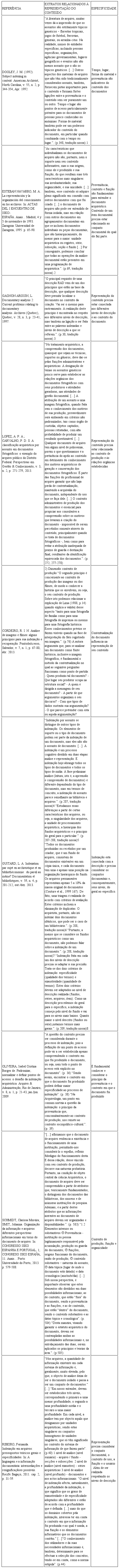 Será apresentada uma breve síntese de cada um dos trabalhos analisados. Dooley (1992) não trata, especificamente, do conteúdo, mas das características que individualizam documentos arquivísticos e ajudam a entendê-los; cita a proveniência, a função e a conexão com outros documentos. O autor apresenta pontos de acesso importantes na identificação tanto da proveniência, quanto do conteúdo, como tempo, lugar e forma do documento.