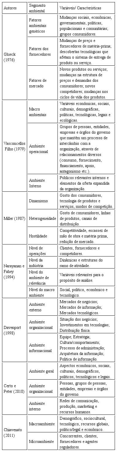 Certo e Peter (2010) afirmam que a análise do ambiente permite identificar as oportunidades e os riscos que podem comprometer o alcance dos objetivos ou metas organizacionais. As variáveis que definem os ambientes organizacionais se apresentam na literatura de maneira diversificada e estão condicionadas às características de um determinado segmento.