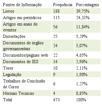 O levantamento revelou que o tipo de fonte de informação mais utilizado é o livro, representando 39,75 % das fontes, seguido dos artigos em periódicos e em anais de eventos. Analisando a quantidade de artigos, destacaram-se como principais eventos: o SNBU (n=30), o CBBD (n=9) e o ENANCIB (n=3).