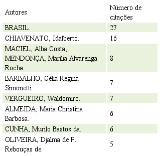 Em relação aos autores mais citados, as publicações governamentais foram as que mais se destacaram, especialmente aquelas que contêm resoluções, manuais, diretrizes e legislação brasileira destinada à regularização e avaliação das IES. A Tabela 2 expõe a utilização de obras de autores da área de administração, como Chiavenato (edições entre 1994-2014) e Oliveira (edições entre 1997-2011). Os demais autores se destacam pelos estudos na área de planejamento, gestão de bibliotecas e gestão da qualidade dos serviços de informação.
