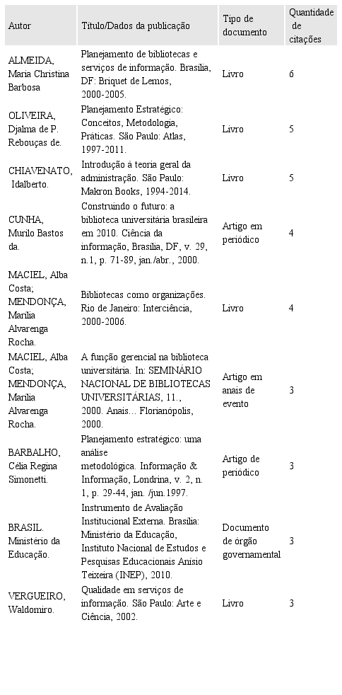As obras mais mencionadas nos trabalhos analisados foram os livros de Almeida (edições entre 2000-2005), que simbolizam o referencial teórico mais utilizado sobre o planejamento estratégico de bibliotecas e serviços de informação; e Oliveira (edições entre 1997-2011), que discorre sobre conceitos, metodologias e práticas voltadas para o planejamento estratégico. Entre as publicações de periódicos, destacou-se um estudo de Cunha (2000) como o artigo mais citado.[1]