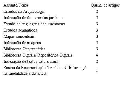 Nesses 25 artigos, também mapeamos 10 categorias de assuntos relativos à representação temática. A estratégia foi categorizar os assuntos abordados nos artigos conforme as semelhanças apresentadas nas pesquisas, quais sejam: estudos na Arquivologia, indexação de documentos jurídicos, estudo de linguagens documentárias, estudos semânticos, mapas conceituais, indexação de imagens, bibliotecas universitárias, bibliotecas digitais/repositórios digitais, indexação de textos de literatura, ensino da Representação Temática da Informação na modalidade a distância.