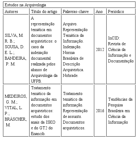Na apresentação e discussão dos resultados, nossa decisão foi apresentá-los na íntegra em forma de quadros para melhor visualização dos dados referentes aos artigos recuperados e às informações relacionadas a eles. Na primeira categoria (quadro 1), identificamos dois artigos que trazem a representação temática no campo de estudo da Arquivologia.