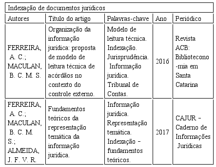 As duas propostas apresentadas no quadro 2 são muito semelhantes e abordam a indexação para documentos jurídicos como possibilidade de melhorar a recuperação da informação nesses documentos. De acordo com Ferreira, Maculan e Almeida (2017, p. 8), “A indexação, também conhecida como representação temática, objetiva proporcionar, aos operadores do Direito, o acesso ao(s) assunto(s) contido(s) na legislação, na doutrina e na jurisprudência”, daí o porquê de toda atenção na concretização do esquema indexal, pois o resultado deverá agilizar o acesso da busca de informações no campo jurídico ou em qualquer outro. Com esse entendimento, pode-se evitar tanto o ruído quanto o silêncio, conforme bem argumenta Chaumier (1988).