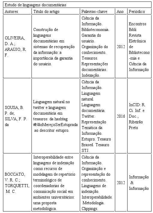 O estudo de linguagens documentárias é sem dúvida um dos pontos primordiais para a realização da indexação. Essa categoria apresentou ocorrência em três dos artigos recuperados. Nos casos descritos, todos os artigos mostraram as linguagens documentárias como mediadoras para recuperação de informação em ambientes digitais. O uso dessas linguagens enquanto instrumento de representação e recuperação da informação permite a comunicação entre o documento, a informação e o usuário (JESUS, 2002). É nesse sentido que os estudos foram apresentados, ressaltando as linguagens documentárias como forma de padronização dos conceitos selecionados visando à representação dos assuntos tratados nos documentos.