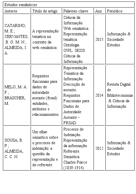 Abstract: This article presents the investigation results of a basic objective to verify, through integrative bibliographic review, trends of subjects related to studies and researches contemplating thematic representation in scientific articles indexed in Base de Dados Referenciais de Artigos de Periódicos em Ciência da Informação. We understand thematic representation or indexation as a complex scheme of actions that aim to identify the main subjects of a document in order to offer “clues” for information retrieval. This research is based on Revisão Bibliográfica Integrativa, a methodology that allows synthesizing content found in scientific literature to evidence manifestation of a certain subject and assisting in subsequent research. The locus of this empirical study was the Base de Dados Referenciais de Artigos de Periódicos em Ciência da Informação database, within the period of 2012-2017. The results show a total of twenty-five articles concerning thematic representation of information, with research tendencies including: Archivology, indexing of legal documents, documentary languages, semantic studies, conceptual maps, indexing of images, university libraries, digital libraries/digital repositories, indexing of literature texts, teaching of thematic representation at a distance. It is concluded that trends of studies and research on thematic representation of information contemplate applications diversity with greater function of access and retrieval of documents.