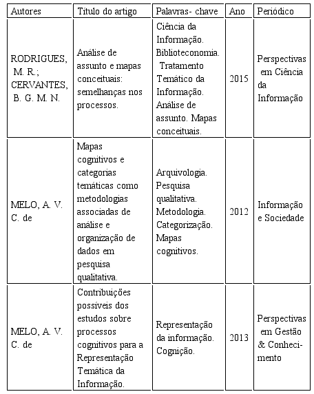 Os mapas conceituais auxiliam no entendimento de conceitos por meio da categorização hierarquizada de um determinado tema ou assunto, estudo que contribui para a representação temática. Tanto os mapas conceituais quanto os cognitivos são representações informacionais, baseadas em esquemas que podem apresentar os conceitos e suas relações. O primeiro artigo (quadro 5) dessa categoria faz um estudo comparativo do processo de elaboração de mapas conceituais e de análise de assuntos. Os autores ressaltam o quanto essas duas atividades se assemelham e apresentam contribuições para a organização e a representação do conhecimento. Os outros dois artigos enfatizam os estudos cognitivos na construção de instrumentos de indexação.