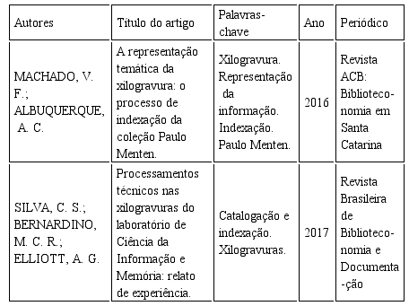Não foi surpresa, devido a sua popularidade nos estudos em representação temática, que tenhamos recuperado dois artigos tratando da indexação de imagens; no entanto, a sua aplicação às xilogravuras é ímpar e não muito comum. Os dois artigos (quadro 6) são semelhantes e apresentam relatos de experiências no processo de indexação de xilogravuras, arte de transferir a imagem desenhada na madeira para o papel. Segundo Machado e Albuquerque (2016, p. 859), “os recursos imagéticos, no caso de estudo as xilogravuras, contêm informações que precisam ser tratadas, ou seja, elas precisam ser organizadas e representadas [...]”, e isso requer princípios adequados que respeitem as características desses documentos.
