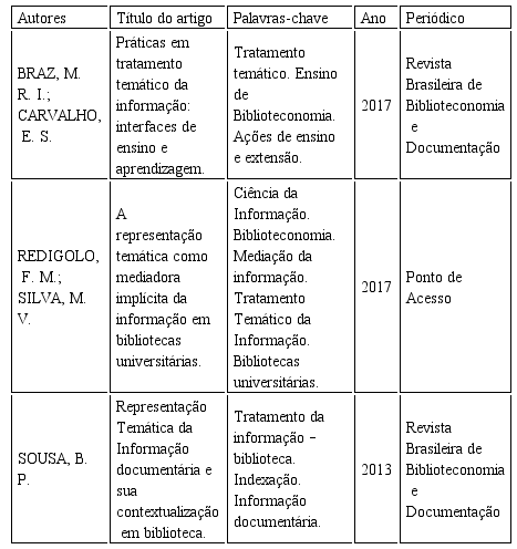 No que concerne à coleta de dados, terceira fase da RBI, escolhemos os artigos que constituiriam o corpus da pesquisa. Assim, selecionamos os artigos científicos publicados em periódicos de CI nos últimos cinco anos, o que significa um recorte temporal de 2012 a 2017. O critério de seleção desses artigos foi que deveriam abordar como um dos objetos de estudo a Representação Temática da Informação ou indexação. A estratégia de busca foi o sintagma “Representação Temática da Informação”. Elaboramos uma planilha para a coleta de dados contendo os metadados: autores, título, aplicação do assunto/temática, ano e periódico, para armazenamento e tratamento dos dados coletados. Para o preenchimento da planilha e mapeamento dos assuntos/temáticas dos artigos, foi necessária a leitura dos títulos, dos resumos e das introduções, dos títulos das seções e, em alguns casos, até mesmo dos documentos na íntegra.