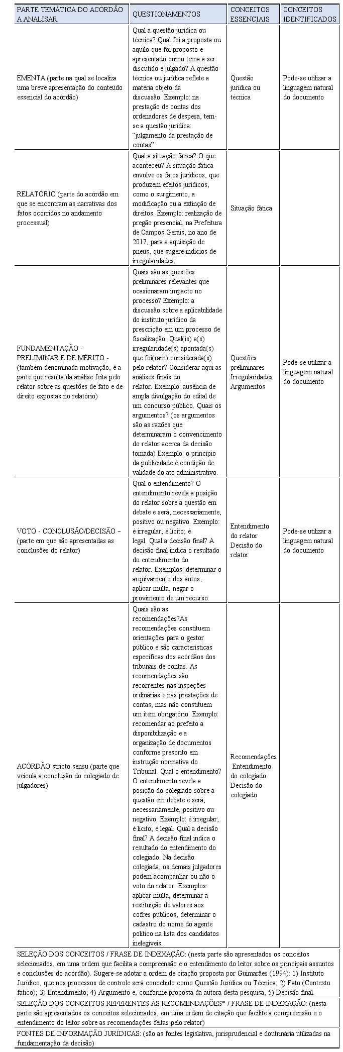 Destaca-se que a aplicação do modelo de leitura pressupõe, inicialmente, a leitura do acórdão para a compreensão dos seus elementos fundamentais. Nesse momento, o indexador ativa as estratégias cognitivas de compreensão do texto, como o conhecimento prévio da língua, da estrutura do acórdão e dos conhecimentos sobre o domínio. Depois, o indexador inicia o processo de leitura técnica, usando suas habilidades metacognitivas de monitoramento de sua compreensão para realizar a leitura com o propósito de identificar os conceitos relevantes para a representação temática. Desse modo, o indexador deve analisar as partes temáticas do acórdão; verificar o questionamento a ser feito a cada parte temática, a partir da análise do conceito essencial apresentado na terceira coluna; e inserir os conceitos identificados em cada parte, em linguagem natural, na última coluna. Sugere-se que as respostas aos questionamentos constantes da terceira coluna sejam formuladas em pequenas frases (como mostrado no exemplo) que facilitem a compreensão do indexador, e, posteriormente, se faça a identificação dos conceitos constantes desses enunciados.