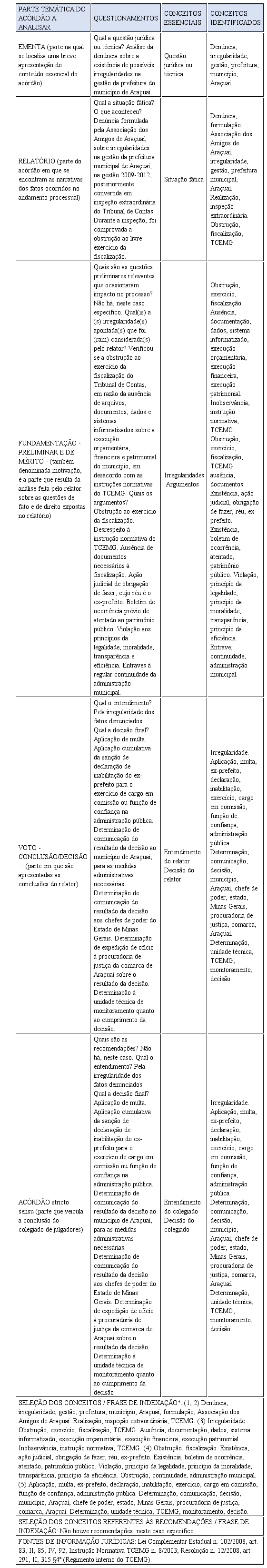 Trata-se de uma denúncia formulada pela Associação dos Amigos de Araçuaí, para a apuração de possíveis irregularidades na gestão da prefeitura municipal do mesmo município, no período de janeiro a março de 2009. A partir da denúncia apresentada, o TCEMG realizou inspeção extraordinária para verificação, in loco, das ocorrências apontadas pelo denunciante. Quando da realização dessa inspeção, no entanto, houve “[...] comprovada obstrução ao livre exercício da fiscalização do Tribunal de Contas [...]” (MINAS GERAIS, 2018, online), segundo o relator, corroborado pela segunda câmara. Desse fato, decorreu a aplicação de multa ao ex-prefeito, no valor de R$ 15.000,00, com fundamento na prerrogativa de o Tribunal poder aplicar multa, de acordo com os casos tipificados no art. 85, IV da Lei Complementar Estadual mineira n. 102 (MINAS GERAIS, 2008). Além da aplicação de multa, a infração cometida pelo ex-prefeito, de dificultar o exercício do controle externo, foi considerada grave, e, por isso, a penalidade foi cumulativa com a declaração de inabilitação do agente público para o exercício de cargo em comissão ou função de confiança da administração pública estadual e municipal, consoante o disposto no art. 83, II, c/c o art. 92 (MINAS GERAIS, 2008) da Lei Complementar supracitada. A determinação do relator de declaração da inabilitação do ex-prefeito foi acolhida pelo Tribunal Pleno, que congrega a maioria absoluta dos membros do Tribunal de Contas. Determinou-se, ainda, a expedição de ofício ao Ministério Público Estadual para ciência do teor da decisão. Veja, no Quadro 2, a aplicação do modelo de leitura técnica nessa denúncia.