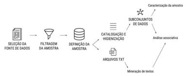 Cabe ressaltar que esse estudo, sendo parte de uma pesquisa maior, em que se analisou diversas variáveis, aponta resultados relacionados apenas a tópicos de pesquisa, abarcados pelas palavras-chave dos artigos e pelos conceitos e palavras-chave retornados pela mineração de textos. Na Figura 1, é delineado o percurso metodológico do estudo.