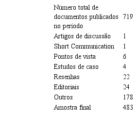 Após a seleção da fonte de dados, foram delineadas escolhas metodológicas buscando uma filtragem da amostra. Nessa filtragem, alguns artigos foram descartados, visto que não constavam como Artigos de Pesquisa Original (Original Research Article), mas sim como artigos de discussão (Discussion), Comunicações Curtas (Short Communication), Estudos de Caso (Case Study) ou artigos de Ponto de Vista (Viewpoint), ou seja, não eram artigos completos de pesquisa. Essa escolha deu-se devido à avaliação de que não se adequavam ao escopo do estudo, o qual foca em artigos completos de pesquisa científica em Design. Assim, também foram desconsiderados editoriais do periódico, resenhas e todos os outros tipos de documentos publicados, como Calendário, Pareceristas, Corpo Editorial, Prêmios, Conferências, Discussões, Errata. A especificação dessa filtragem pode ser visualizada na Tabela 1.