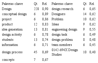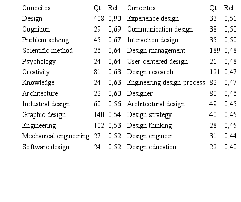 Foram cinco as palavras-chave presentes em ambos os âmbitos. Dessas, “design activity” foi duplicada no AlchemyAPI em “design activities”, o que, junto a sua alta frequência de citação, pode corroborar para sua relevância no periódico. Pondera-se também que algumas palavras-chave servem mais para um enquadramento epistemológico-metodológico da publicação, o que as levou a não serem muito citadas nos textos. Exemplos: “case study/studies”, “architectural design”, “protocol analysis”, “philosophy of design”. Por último, mesmo que grande parte das palavras-chave dos dois âmbitos sejam diferentes entre si, diversas delas estão relacionadas, como “creativity”, que pode ser associada a “idea generation”, “ideas” e “concepts”; “design education”, que se relaciona a “students”; “collaborative design” e “team members”; “product design” e “product”. Algumas palavras-chave que constavam nos metadados também foram identificadas pelo AlchemyAPI, apesar de que com menos frequência: “product design”, “creativity”, “design education/practice”. Assim, pode-se dizer que a mineração dos textos completos feita pela ferramenta é válida e se relaciona com as palavras-chave dos artigos, ainda levantando novos tópicos. Além das palavras-chave, são apresentados na Tabela 3 os conceitos retornados pela AlchemyAPI.