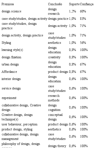 Podemos pensar, a partir da segunda regra, como exemplo para melhor compreensão, que, considerando os 483 documentos analisados, 5 destes (1% de suporte) apresentaram a combinação das palavras-chave case study/studies, design activity e design practice. Considerando todos os documentos que apresentaram a premissa case study/studies e design activity, 83% deles também apresentaram a conclusão design practice. Ou seja, haviam 6 documentos com a premissa da regra e destes 6, apenas 5 (83%) apresentam também a conclusão.