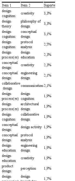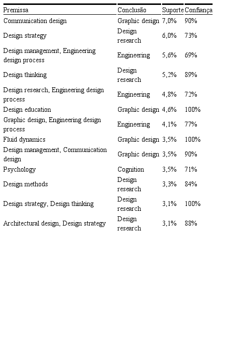 Primeiramente, na Tabela 6, o alto suporte e confiança entre “Communication design” e “Graphic design” sugere uma forte associação do primeiro com o segundo, provavelmente relacionada com o projeto de peças comunicacionais gráficas. Por essas regras, pode-se concluir que “Design research” não foi associado principalmente a questões mais teórico-epistemológicas do campo, mas sim à prática do design.
