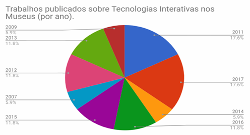 No primeiro processo de refinamento – seleção dos títulos nas bases de dados – foram obtidos 113 títulos no Banco de Teses e Dissertações CAPES e 48 da BDTD. Cabe ressaltar que a consulta ocorreu primeiro na Base CAPES, portanto, títulos repetidos foram naturalmente excluídos das buscas no BDTD. Em um processo de aferição, foram eliminados mais 7 trabalhos repetidos. Na segunda etapa – seleção de pesquisas que tratam do uso de tecnologias interativas dentro do ambiente físico do museu – o resultado foi de 38 trabalhos. Destas, 4 não estavam disponíveis na web e 17 não se encaixavam nos critérios estabelecidos pela presente proposta e, portanto, foram excluídos. Por fim, outros 17 trabalhos passaram por todas etapas do processo e compuseram o conjunto final de trabalhos a partir do qual foram extraídos os dados.