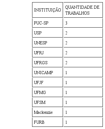 A Pontifícia Universidade Católica de São Paulo (PUC-SP) aparece vinculada a 3 trabalhos; a Universidade de São Paulo (USP) a 2; a Universidade Estadual Paulista (UNESP) a 2; a Universidade Federal do Rio de Janeiro (UFRJ) a 2; a Universidade Federal do Rio Grande do Sul (UFRGS) a 2; a Universidade Estadual de Campinas (UNICAMP) a 1; a Universidade Federal de Juiz de Fora (UFJF) a 1; a Universidade Federal de Minas Gerais (UFMG) a 1; a Universidade Federal de Santa Maria (UFSM) a 1; a Universidade Presbiteriana Mackenzie a 1 e a Universidade Regional de Blumenau (FURB) a 1. A Tabela 1 abaixo resume esta distribuição.