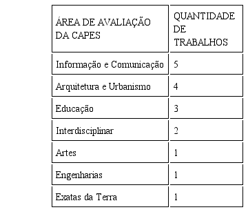 Sendo assim, foram utilizadas estas áreas atualizadas. Com isso, a área de “Comunicação e Informação” é a mais representada no conjunto pesquisado, com 5 trabalhos. Arquitetura, Urbanismo e Design aparece em 4 pesquisas (2 Arquitetura e Urbanismo, 1 Desenho Industrial e 1 Projeto, Espaço e Cultura). Na área da Educação, foram encontrados 3 trabalhos[10], assim como na área Interdisciplinar. As áreas de engenharias (Engenharia Civil), Ciências Exatas e da Terra (Matemática) e Artes são representadas por 1 trabalho cada. A Tabela 2 ilustra estes dados.