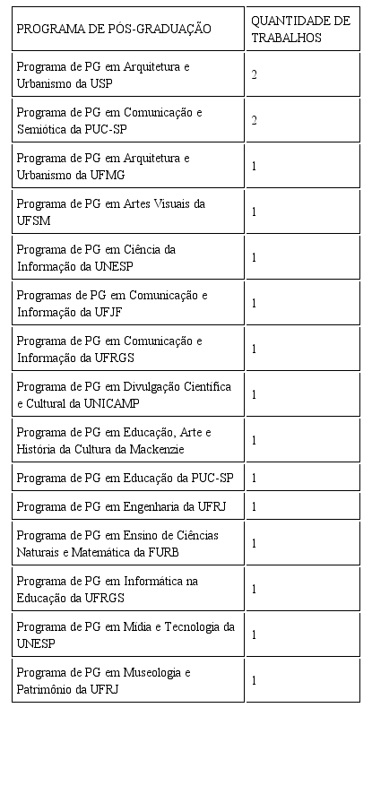 No que se refere especificamente aos Programas de Pós-Graduação (PG), a maior ocorrência foi de apenas 2 trabalhos desenvolvidos em 2 programas: o Programa de Pós-Graduação em Comunicação e Semiótica da PUC-SP e o Programa de Pós-Graduação em Arquitetura e Urbanismo da USP. Todos os demais Programas de PG tiveram a ocorrência de apenas 1 trabalho em seu ambiente: Programa de PG em Arquitetura e Urbanismo da UFMG; Programa de PG em Artes Visuais da UFSM; Programas de PG em Comunicação e Informação da UFJF e da UFRGS; Programa de PG em Divulgação Científica e Cultural da UNICAMP; Programa de PG em Educação, Arte e História da Cultura da Mackenzie; Programa de PG em Educação da PUC-SP; Programa de PG em Engenharia da UFRJ; Programa de PG em Ensino de Ciências Naturais e Matemática da FURB; Programa de PG em Informática na Educação da UFRGS; Programa de PG em Mídia e Tecnologia da UNESP; Programa de PG em Museologia e Patrimônio da UNIRIO. O Programa de PG em CI da UNESP é o único nomeadamente inscrito no campo da CI. A Tabela 3 apresenta estes dados.