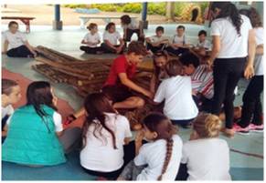 Nos encontros, eram discutidos os motivos da escolha do tipo de madeira, quais eram as técnicas de corte, quais os passos para a construção e o manejo da balsa. Qual era a madeira utilizada? Como o cipó era amarrado? O que acontecia a partir da derrubada das árvores? Quais ferramentas eram utilizadas? E hoje, seria possível uma balsa descer o Rio Uruguai? Como era a região antes e depois da derrubada das árvores? Hoje, ainda seria possível construir uma balsa com essas árvores? Por quê? Qual é o impacto ambiental provocado pela ação dos balseiros? Essas perguntas permitiram uma aproximação entre as três gerações, ou seja, a dos balseiros, a dos professores e a dos alunos, numa ação educativa de valorização e reconhecimento daquela atividade e de uma contextualização mais humana e solidária desta, considerada tradicionalmente apenas por seu lado predatório e impactante. Finalmente, sob a orientação de quatro balseiros, na Figura 4 observa-se os alunos iniciando a construção da maquete de balsa: