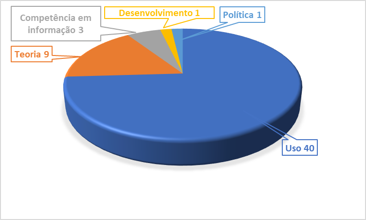 A partir das categorias propostas por Santos et al. (2013), ampliadas por França, Carvalho e Grácio (2018), a organização do conhecimento produzido na temática analisada permitiu identificar que a maioria dos trabalhos (74,1%) se refere ao uso das mídias sociais em bibliotecas (serviços de bibliotecas, apropriação, marketing, promoção da leitura, serviços de orientação, disseminação da informação, automação de bibliotecas, preservação digital), seguido de 16,7% que aborda questões teóricas (marketing, serviços de biblioteca, disseminação da informação, serviços de orientação, redes sociais); 5,5% que se enquadra na categoria competência em informação (alfabetização em informação e alfabetização em tecnologia da informação) e uma minoria que trata de desenvolvimento (programas de computador) (1,8%) e questões políticas (políticas e ações de informação) (1,8%), conforme apresentado no Gráfico 8. Não foi identificado nenhum artigo voltado para as questões éticas.