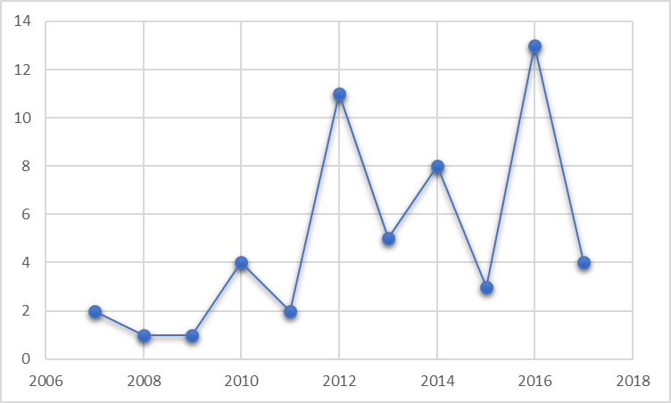 Os primeiros estudos sobre mídias sociais e bibliotecas surgem na produção científica nacional a partir de 2007, três anos após o empresário e entusiasta da internet, Tim O’Reilly, ter concebido o conceito de Web 2.0. A evolução da produção científica sobre o tema em questão pode ser observada no Gráfico 1, sob uma perspectiva diacrônica, com os maiores índices registrados em 2012 e 2016 e queda considerável, respectivamente, em 2013 e 2017.