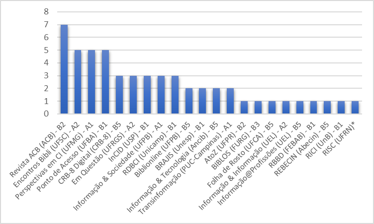 Fonte: Elaborado pelas autoras.Neste sentido, dentre os periódicos que mais publicam artigos sobre mídias sociais e bibliotecas, destacam-se a) Revista ACB: Biblioteconomia em Santa Catarina da Associação Catarinense de Bibliotecários (ACB, São José, SC); b) Encontros Bibli: Revista Eletrônica de Biblioteconomia e Ciência da Informação da Universidade Federal de Santa Catarina (UFSC, Florianópolis, SC), c) Perspectivas em Ciência da Informação da Universidade Federal de Minas Gerais (UFMG, Belo Horizonte, MG) e d) Ponto de Acesso da Universidade Federal da Bahia (UFBA, Salvador, BA), que publicaram, nestes últimos dez anos, pelo menos cinco artigos cada.