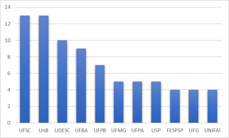 No Brasil, observa-se que a UFSC (12,1%), a Universidade de Brasília (UnB) (12,1%), a Universidade do Estado de Santa Catarina (UDESC) (9,3%), a UFBA (8,4%) e a Universidade Federal da Paraíba (UFPB) (6,5%) destacam-se por possuírem o maior número de colaboradores que desenvolvem pesquisas no domínio analisado, com pelo menos uma publicação nos últimos três anos (2015-2017) (Gráfico 3).