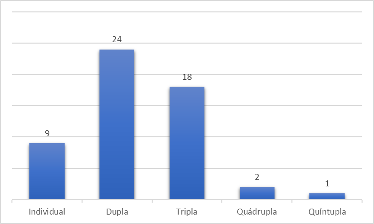Em relação aos percentuais por tipo de autoria presentes na produção científica analisada, observa-se a prevalência das publicações em coautoria, correspondendo a 83,3%, evidenciando a presença de colaboração científica na temática (Gráfico 4). O número de trabalhos com autoria dupla é o mais frequente (44,4%), apresentando predominância desde 2007, com exceção nos anos de 2008-2009 e 2015. Em 2012, foram publicados os artigos de autoria quádrupla e, em 2015, o de quíntupla.