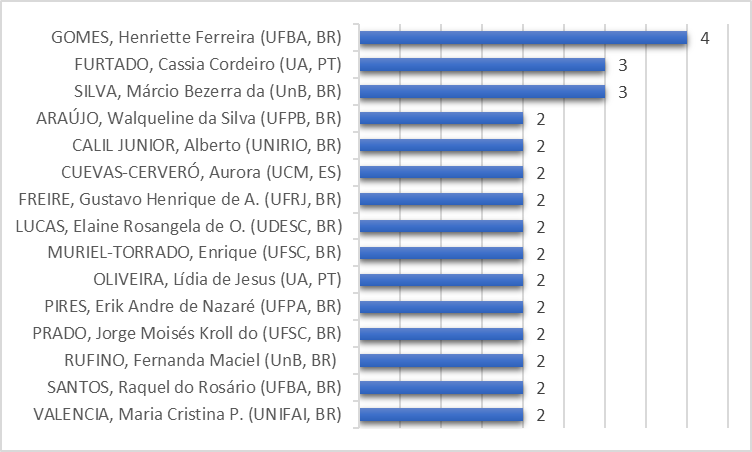Os 15 autores com o maior número de publicações na temática analisada (Gráfico 5) são responsáveis por pelo menos dois trabalhos publicados, sendo alguns deles de autoria individual.