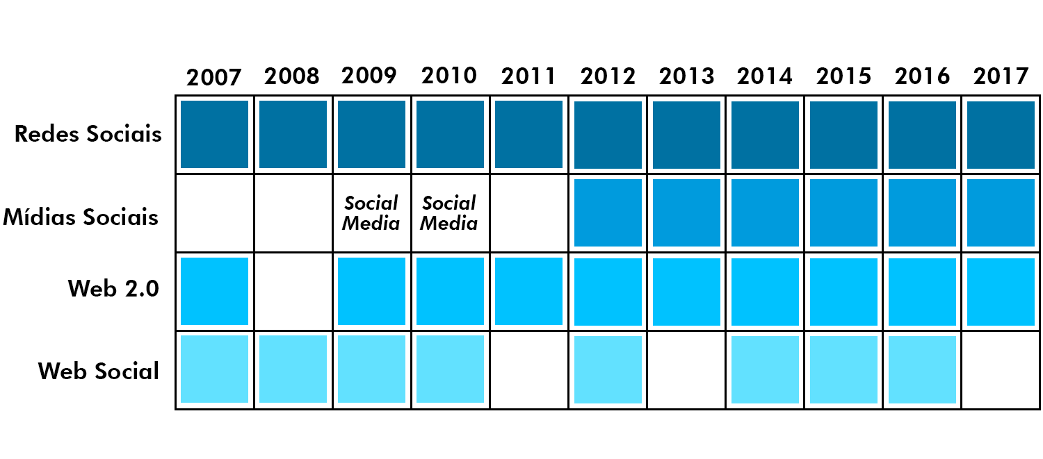 Embora redes sociais seja o descritor preferido da comunidade discursiva da CI para designar os ambientes de interação mediados pelo computador/internet e, consequentemente, representar o domínio analisado, é possível afirmar que o termo mídias sociais, desde 2012, tem conquistado um espaço de destaque na produção científica da área, acompanhando o movimento já percebido na Comunicação Social desde o início dos anos 2000, fundamentado nos conceitos da Web 2.0 de Tim O’Reilly.