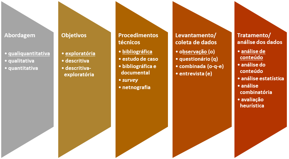 No Brasil, as pesquisas da Ciência da Informação sobre mídias sociais têm sido aplicadas nos mais diversos tipos de bibliotecas, com predileção pelo âmbito das bibliotecas universitárias. Quanto à classificação das pesquisas, observou-se que a abordagem mais usual foi a qualiquantitativa e, quantos aos objetivos, destacou-se a pesquisa exploratória. Em relação aos procedimentos técnicos, identificou-se o predomínio da pesquisa bibliográfica. A observação foi apontada como um dos instrumentos de coleta mais utilizado e para tratamento dos dados, a análise de conteúdo, de Bardin. Tornar público o percurso metodológico adotado para o desenvolvimento de uma pesquisa é um dos elementos que contribui para sua legitimação científica, passível de ser analisada, testada, ampliada e, até mesmo, contestada por outros pesquisadores. Neste contexto, curiosamente, metade das pesquisas analisadas não apresenta uma seção específica para descrição da metodologia de pesquisa adotada.