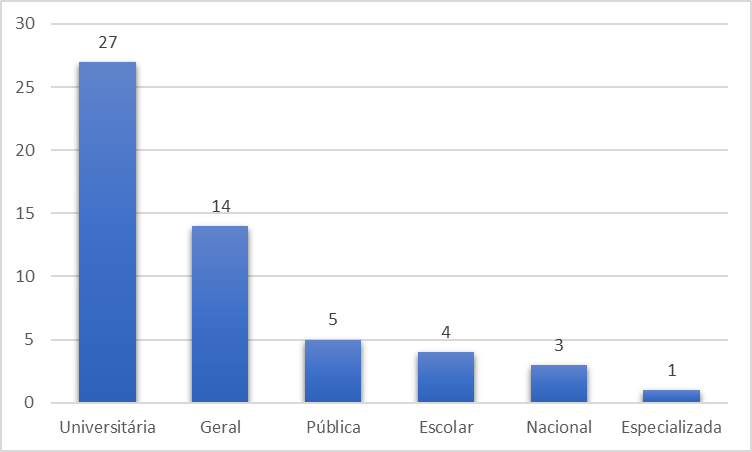 Fonte: Elaborado pelas autoras.A maioria dos trabalhos analisados investiga as mídias sociais em geral (76%); no entanto, também foram identificados estudos aplicados em mídias sociais específicas, como Facebook, Youtube, Twitter, mídias sociais temáticas (ex. Biblon – rede social de leitores), dentre outras. Quanto à esfera de aplicação, é possível afirmar que pesquisas relacionadas à temática central analisada têm sido desenvolvidas preferencialmente nas bibliotecas universitárias (50%), ratificando os resultados encontrados na pesquisa de França e Carvalho (2018). Também foram identificados estudos em bibliotecas em geral (25,9%), bibliotecas públicas (9,3%), bibliotecas escolares (7,4%), bibliotecas nacionais (5,6%) e bibliotecas especializadas (1,9%) (Gráfico 7).