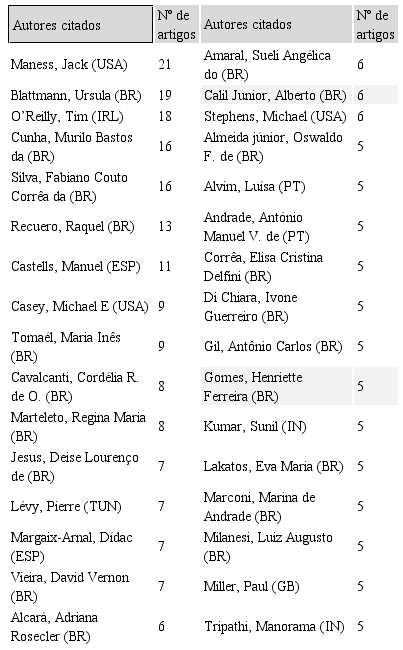 Também se destacam, na Ciência da Informação brasileira, os bibliotecários e docentes Murilo Bastos da Cunha, vinculado ao PPGCI da UnB, e Fabiano Couto Corrêa da Silva, vinculado à Universidade Federal do Rio Grande (FURG), ambos mencionados em 16 artigos. O irlandês Tim O’Reilly, criador da expressão Web 2.0, também se encontra entre os autores mais citados, sendo referenciado em 18 artigos e, ainda, a pesquisadora brasileira no campo da Comunicação, Raquel Recuero (13) e o sociólogo espanhol, Manuel Castells (11) (Quadro 1).
