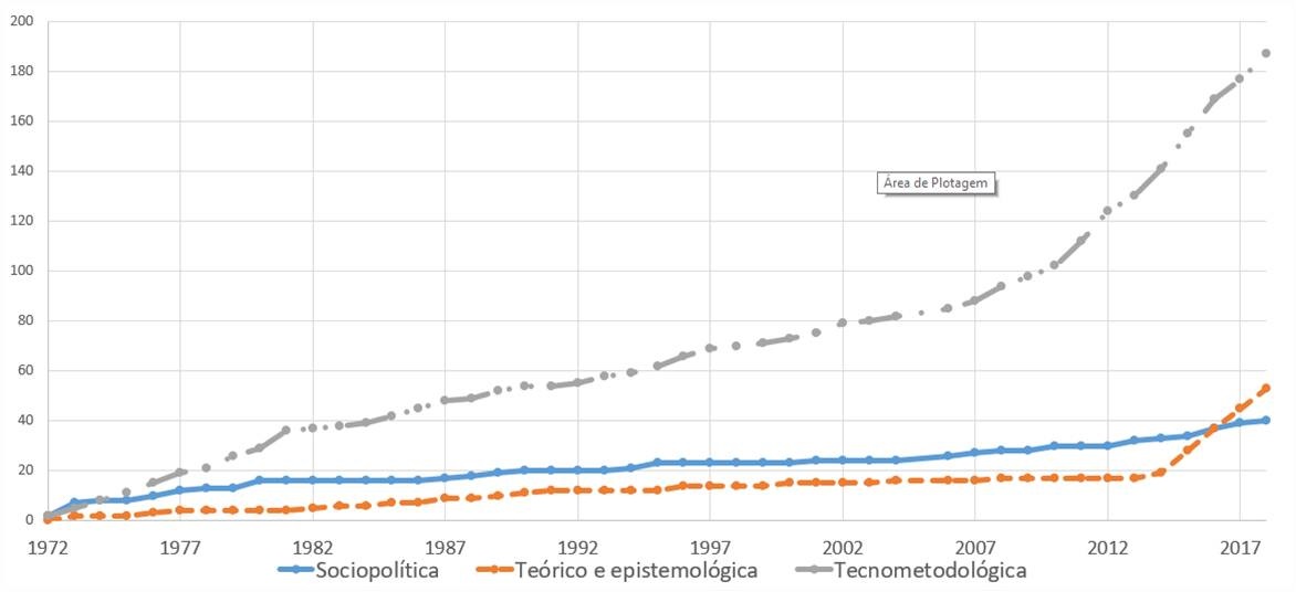 A percepção inicial, resultante do estudo exploratório sobre a produção brasileira relativa ao tema, na Brapci, foi de que as ênfases dos estudos se distribuíam entre as dimensões teórico e epistemológica (TE), tecnometodológica (TM) e sociopolítica (SP). E, com a intenção de organizar o corpus para favorecer a análise diacrônica, os artigos foram dispostos nos períodos de 1972 a 1981, 1982 a 1991, 1992 a 2001, 2002 a 2011 e 2012 a 2018.
