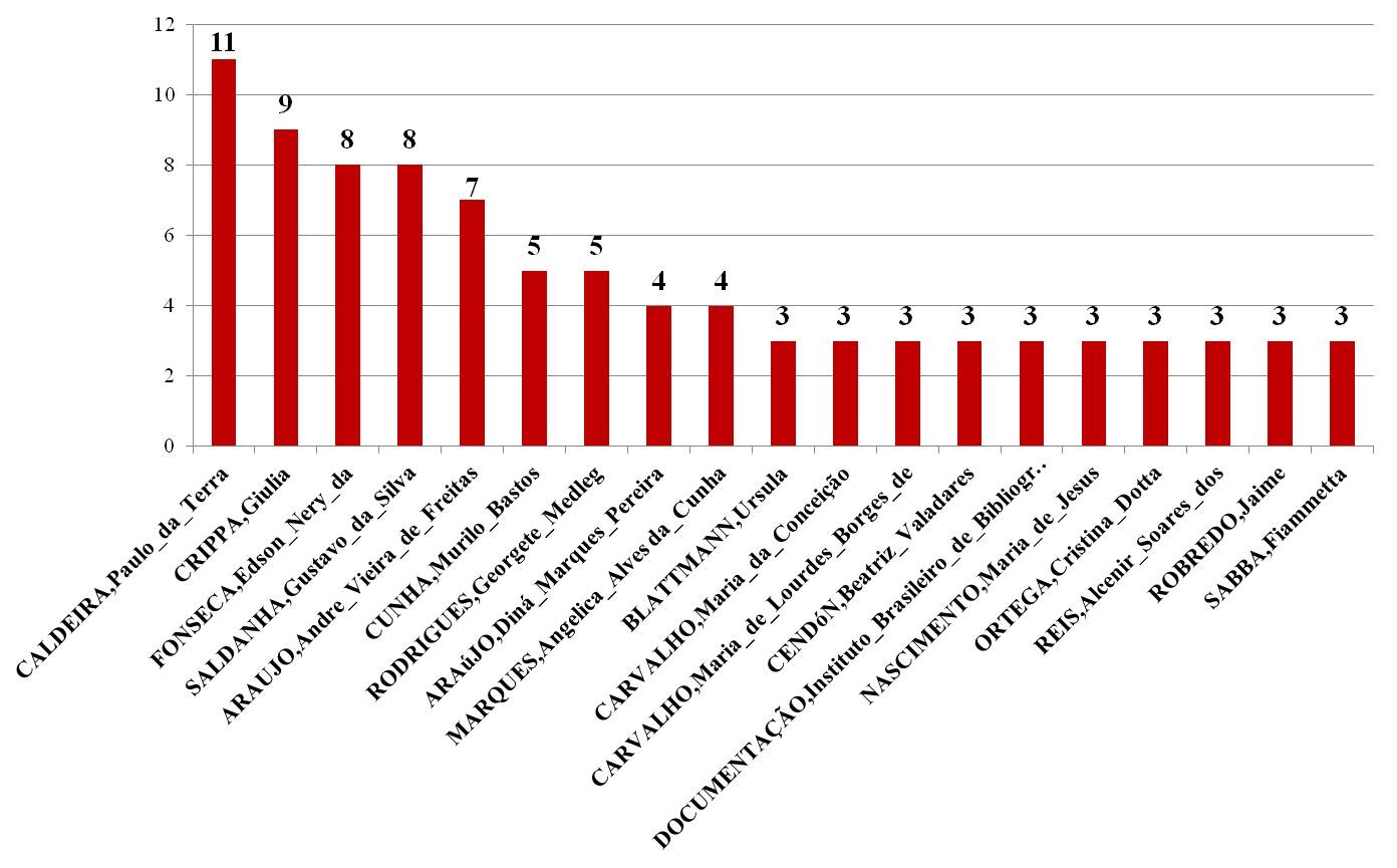 Foi escolhida a escala +40 para a visualização dos 68 autores mais frequentes, o que permite identificar o grau de comparação entre os autores, em níveis quantitativos.