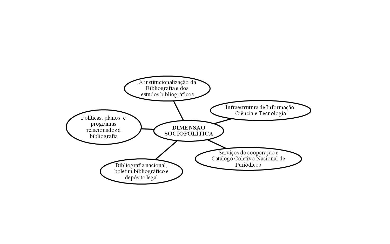 A dimensão sociopolítica inclui, assim, cinco categorias: a institucionalização da bibliografia e dos estudos bibliográficos; as políticas, planos e programas relacionados à bibliografia; a Bibliografia nacional, o Boletim Bibliográfico e o Depósito Legal (estabelecido no Brasil pelo Decreto Legislativo nº 433, de 3 de julho de 1847); os serviços de cooperação e o Catálogo nacional de Periódicos e a Infraestrutura de Informação, Ciência e Tecnologia.