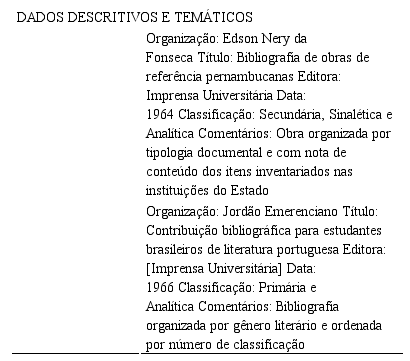 O quadro revela que os dois organizadores destacados foram professor (Edson Nery da Fonseca) e aluno (Jordão Emerenciano) da primeira turma do Curso de Biblioteconomia da então denominada Universidade do Recife (que logo depois se tornou Universidade Federal de Pernambuco) e ambas as obras foram publicadas pela Imprensa Universitária. Verifica-se também que as bibliografias são analíticas porque estabelecem sínteses documentárias dos itens listados, embora se dediquem a tipologias documentais distintas.